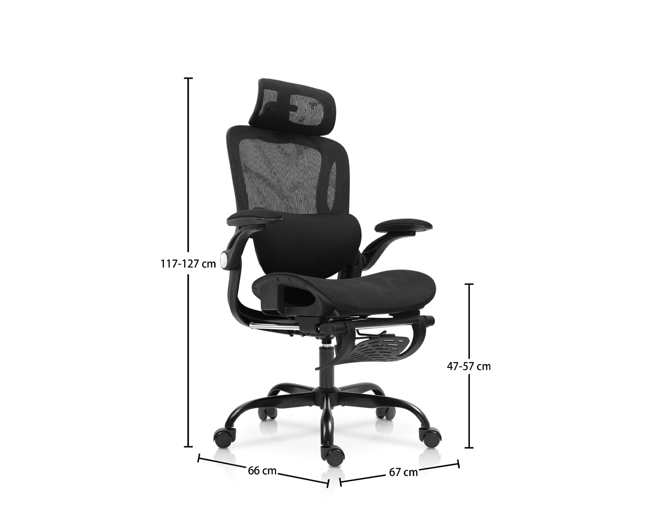 • A cadeira é projetada com um encosto ergonômico que suporta a curva natural da sua coluna, promovendo melhor postura e reduzindo a dor nas costas durante os períodos prolongados. Os apoios de braços são totalmente ajustáveis, permitindo que os usuários os posicionem na altura ideal para reduzir a tensão no ombro. Um apoio para os pés retrátil embutido aumenta a funcionalidade da cadeira, oferecendo conforto adicional para relaxar ou ao trabalhar por longos períodos.