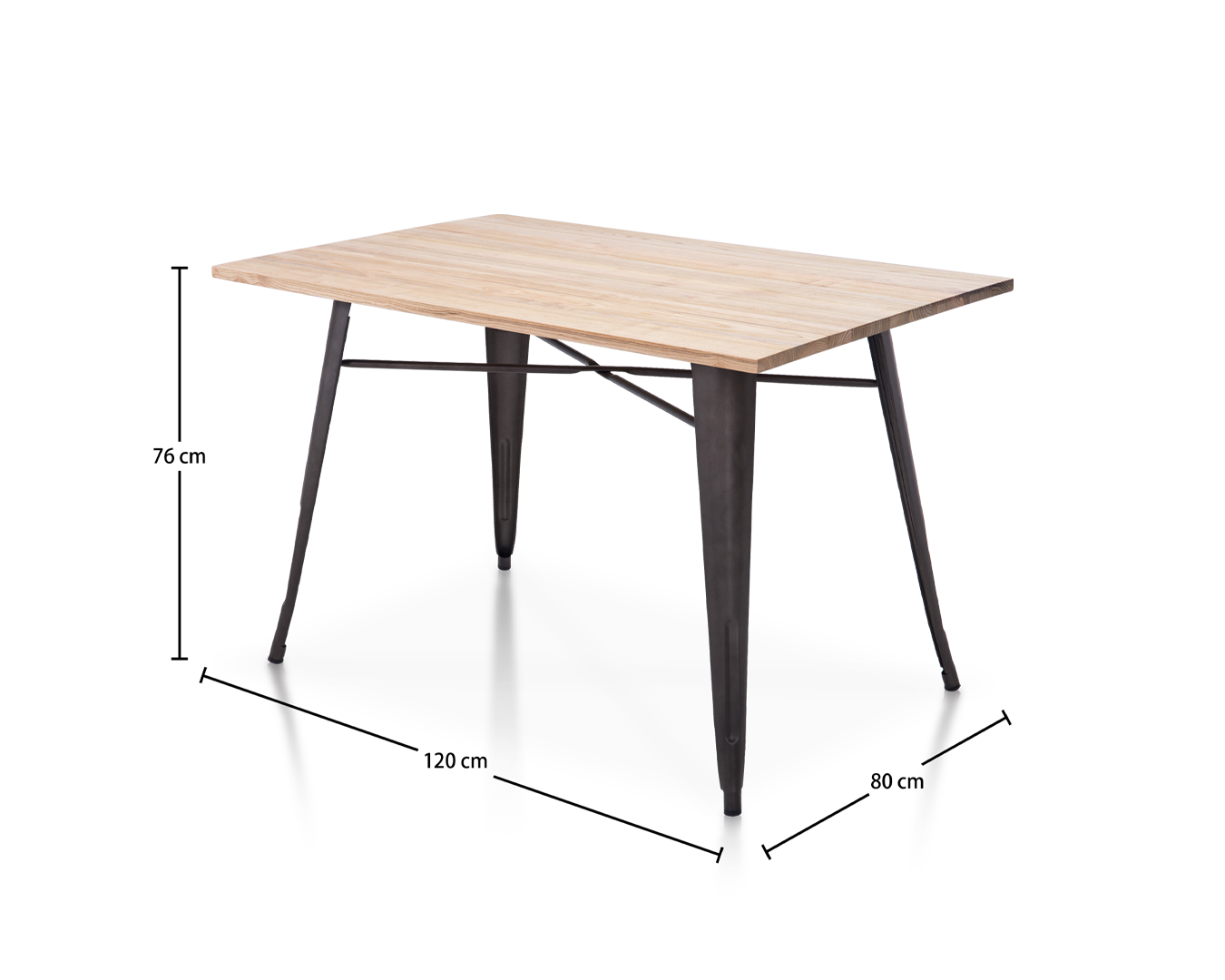 • A mesa é feita de madeira de elmo premium, conhecida por sua durabilidade e textura rica. O acabamento polido destaca a beleza natural da madeira, acrescentando uma sensação de calor e caráter a qualquer sala. Complementando a parte superior de madeira, há pernas de ferro robustas, acabadas em uma cor preta fosca que adiciona um toque moderno e industrial. Essa mistura única de materiais garante que a tabela possa suportar o uso diário, mantendo sua aparência elegante.